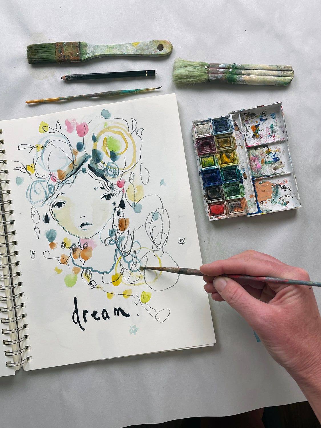 The invitation is to slow down, take a breath, and get calm. Take your journal or sketchbook and play with watercolors, color in a coloring book or just pick up a pencil and doodle. I’ve put together a New Free Painting Class to help you get started here.